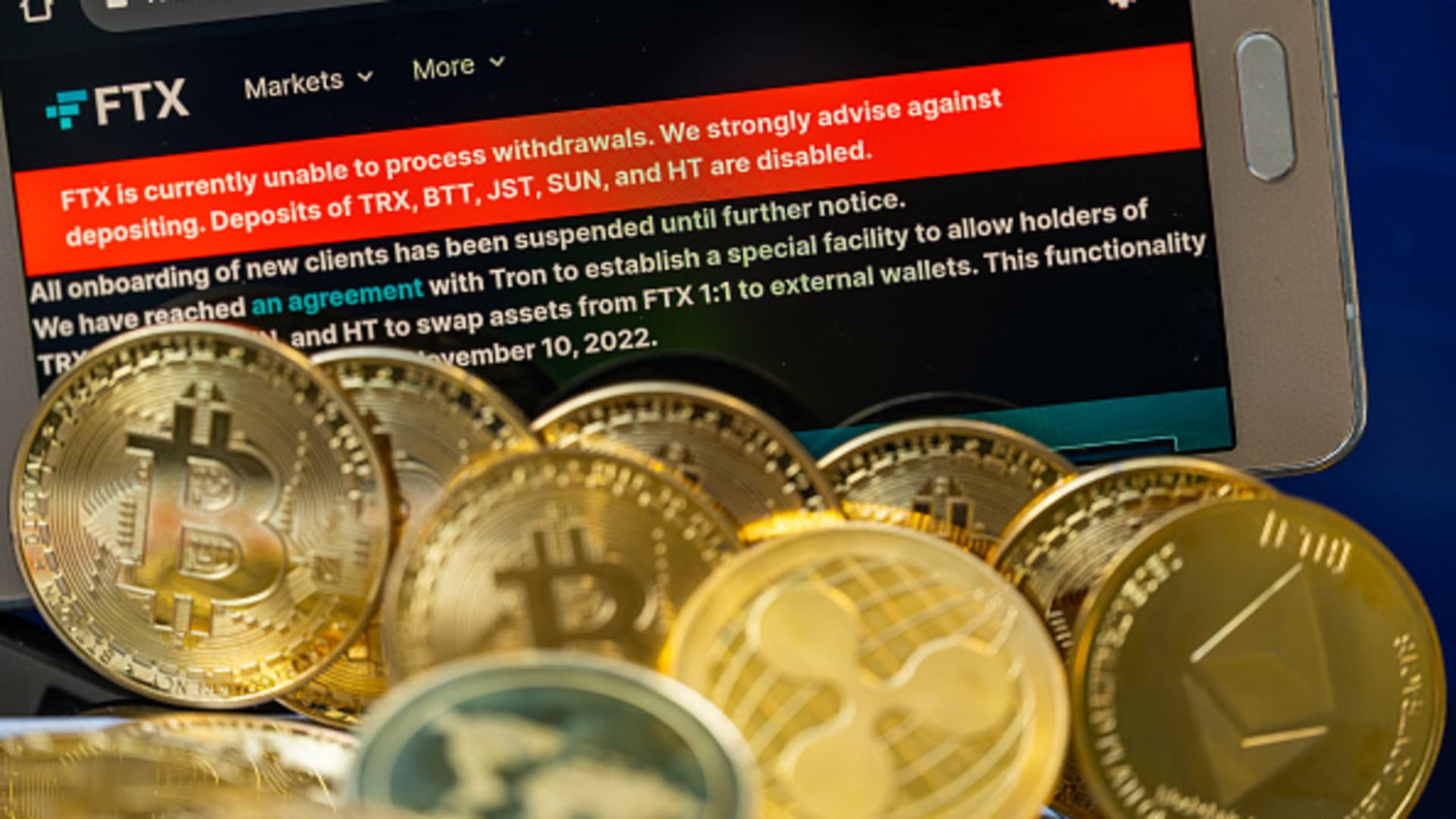 FTX logo with crypto coins with 100 Dollar bill are displayed for illustration. FTX has filed for bankruptcy in the US, seeking court protection as it looks for a way to return money to users.