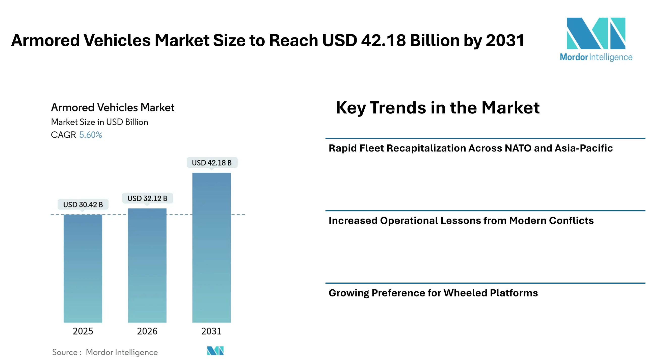 According to Mordor Intelligence, the armored vehicles market size is projected to grow from USD 30.42 billion in 2025 to USD 32.12 billion in 2026 and is expected to reach USD 42.18 billion by 2031, registering a CAGR of 5.6% during the forecast period. The armored vehicles industry is witnessing steady expansion as governments accelerate fleet replacement programs and strengthen land-force capabilities.