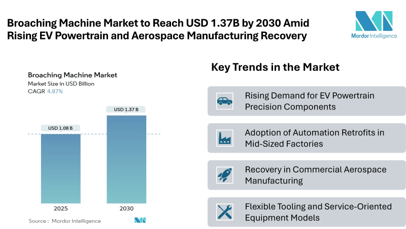 According to Mordor Intelligence, the broaching machine market size is estimated at USD 1.08 billion in 2025, and is expected to reach USD 1.37 billion by 2030, at a CAGR of 4.87%. Asia-Pacific leads the market in revenue share due to rising industrial activities and high production volumes, while North America is expected to witness significant expansion over the forecast period.